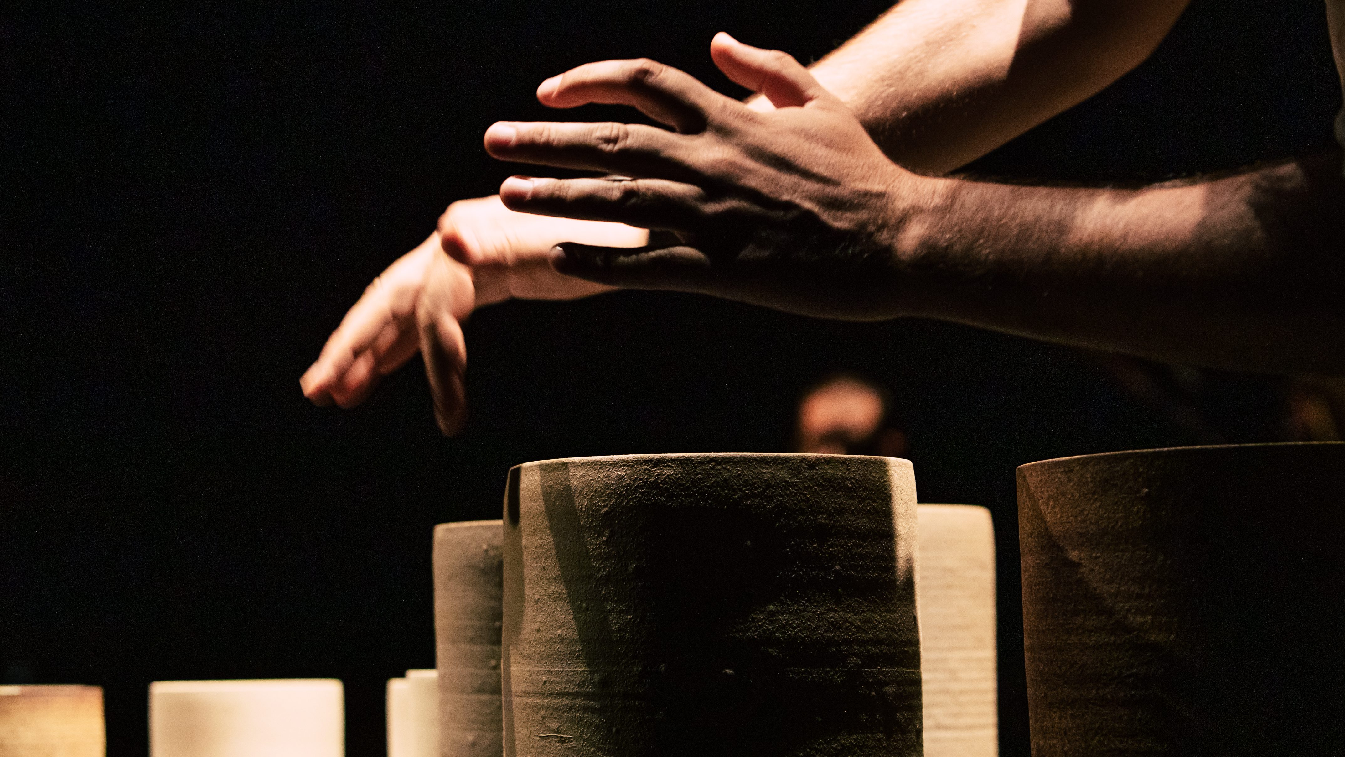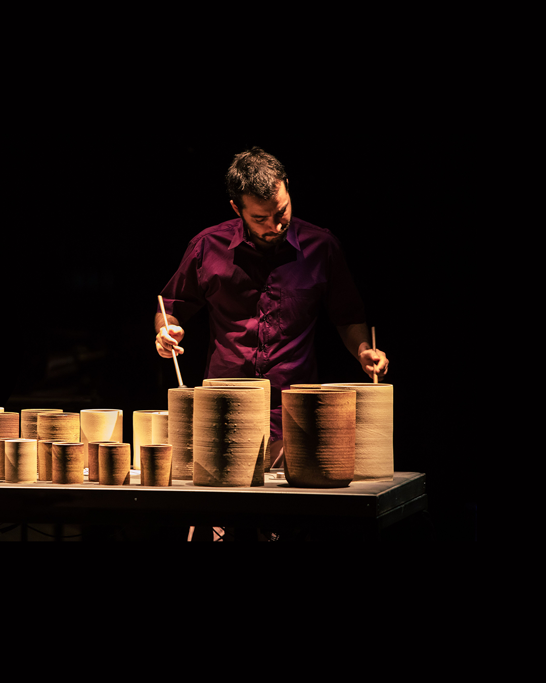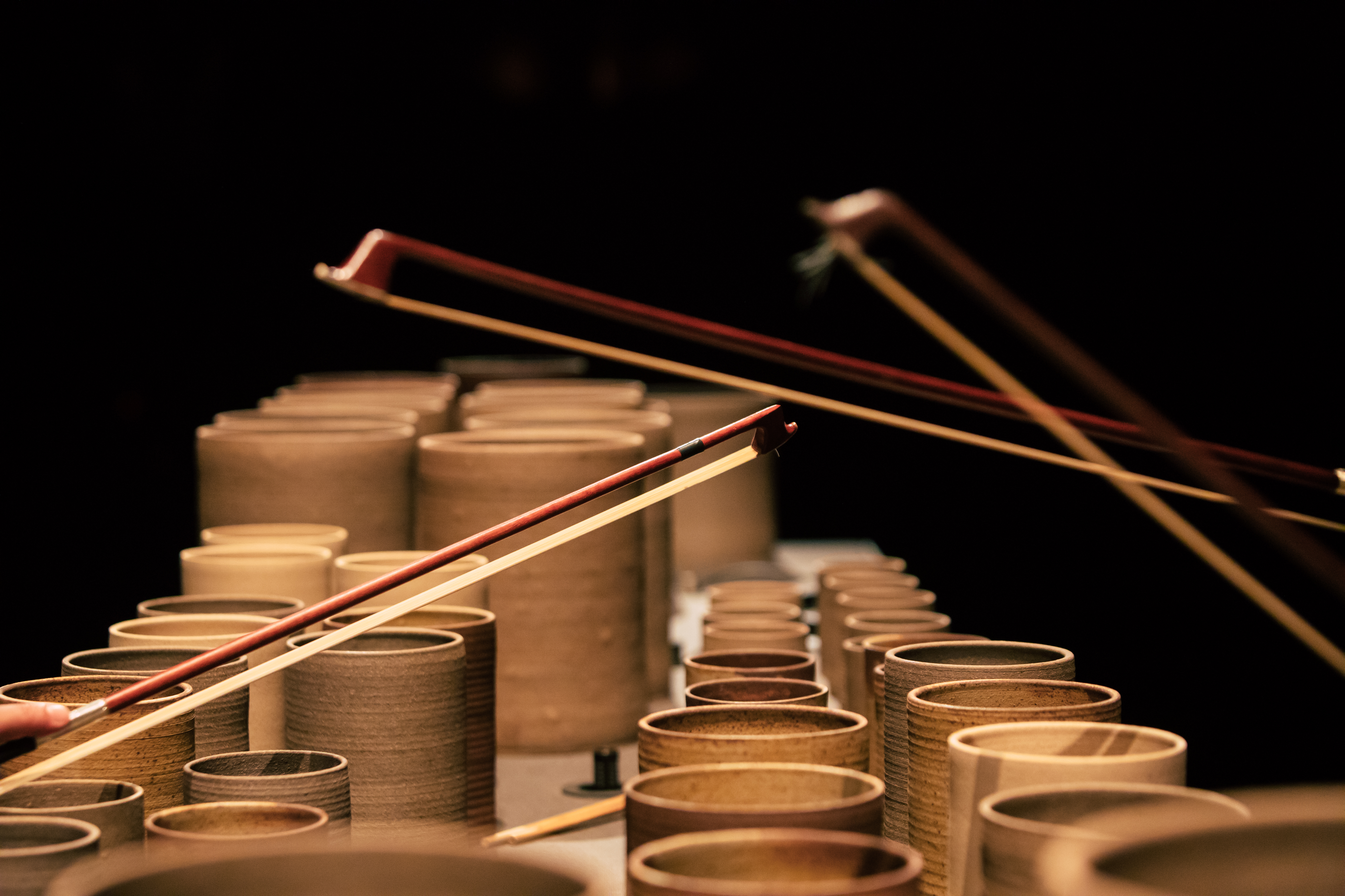 The MINERAL art installation by the artist Máximo Soalheiro can be understood as a great musical instrument arranged in two series of ceramic pieces on microphoned tables that allows the execution of erudite and popular repertories. The dozens of pieces, of different heights, thicknesses and diameters, have a unique sound and are micro-tuned with water added inside each column.