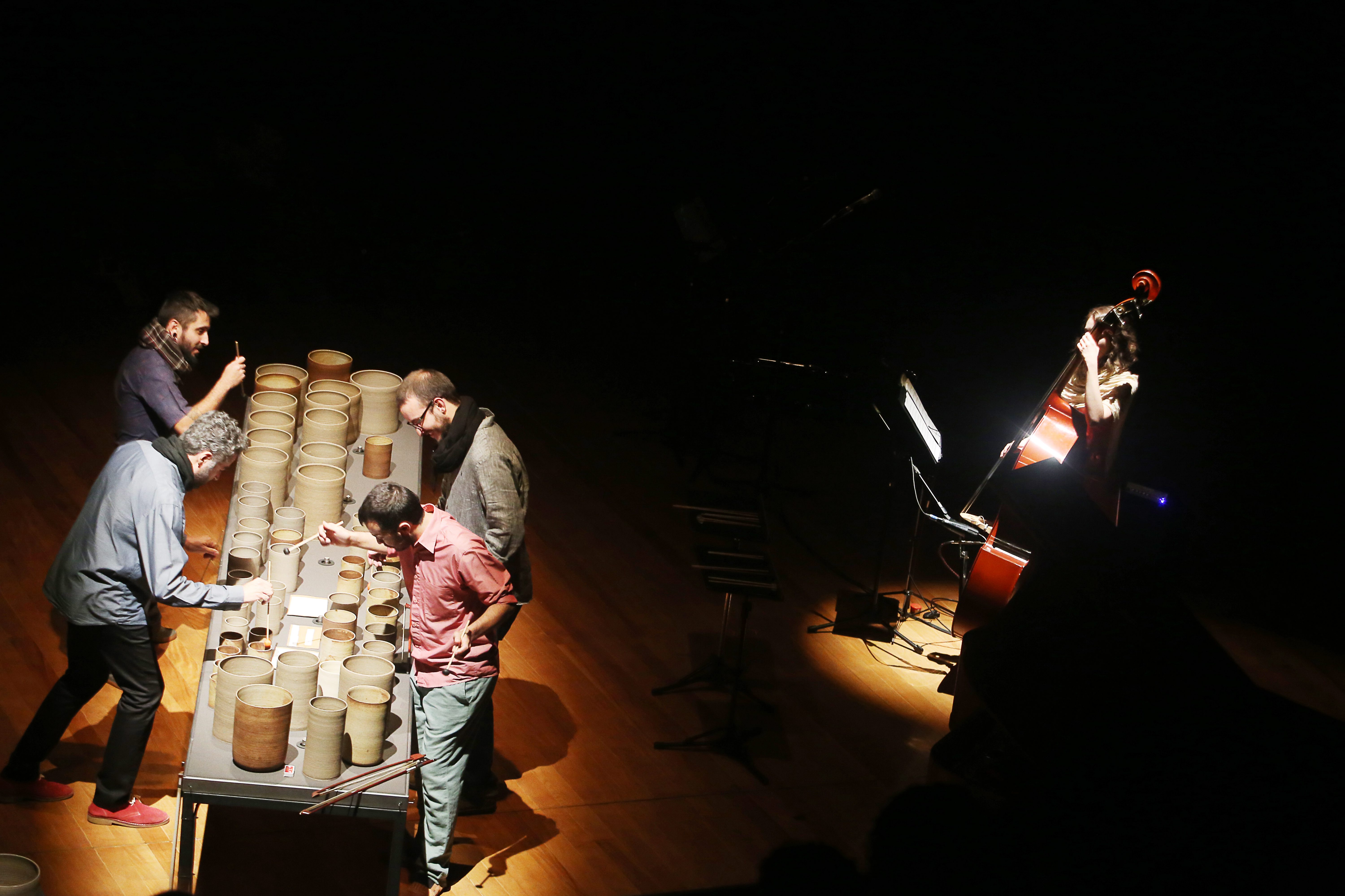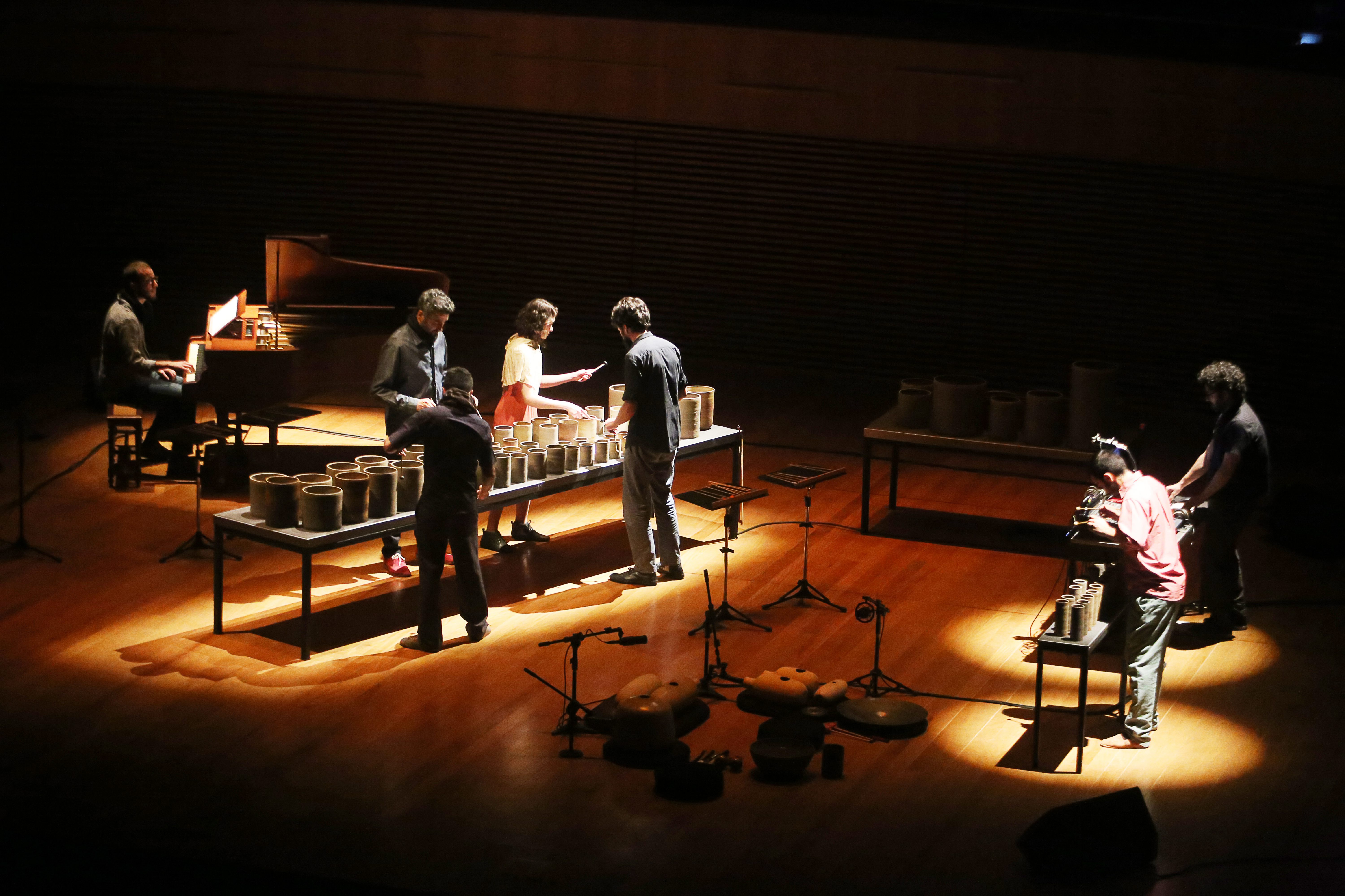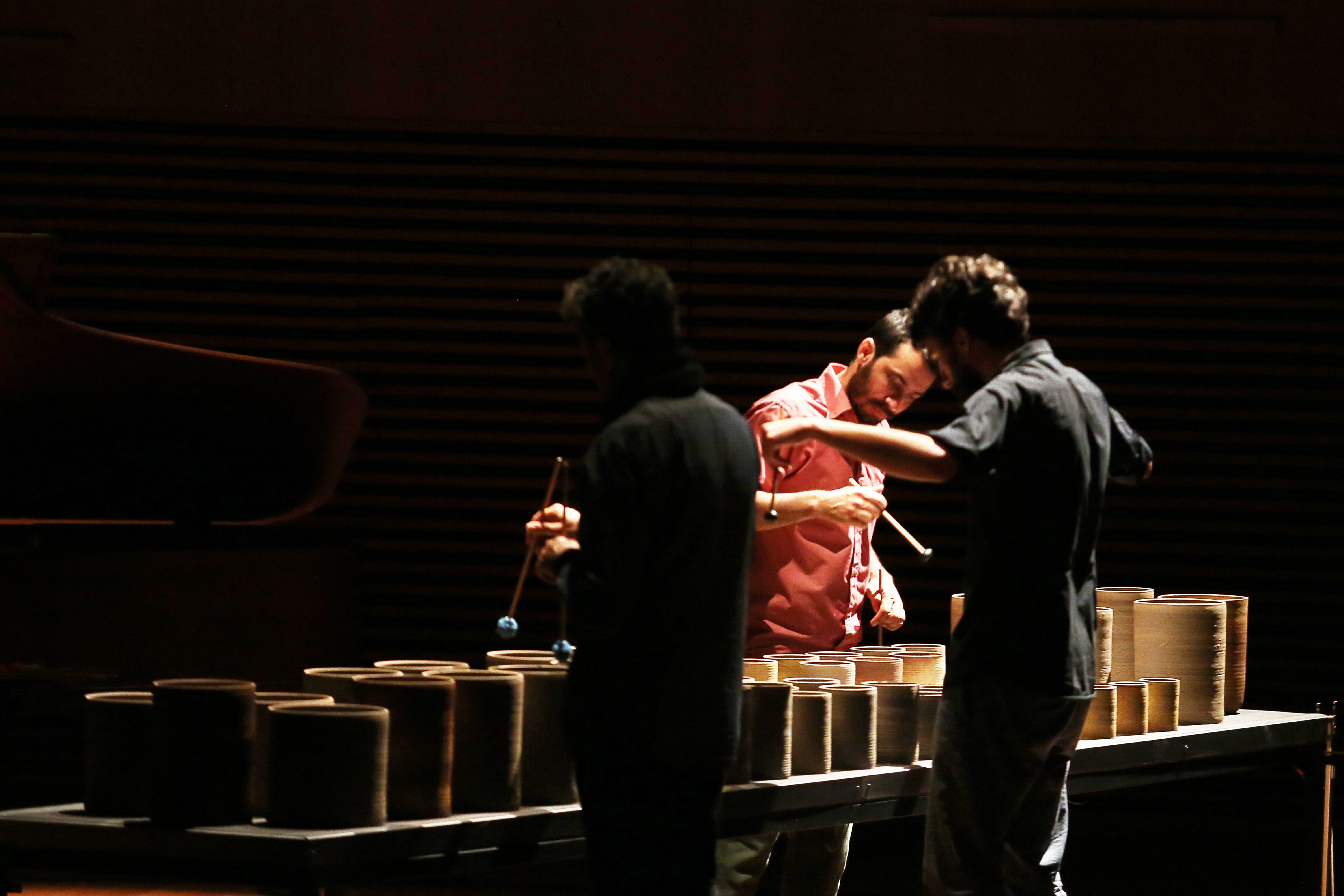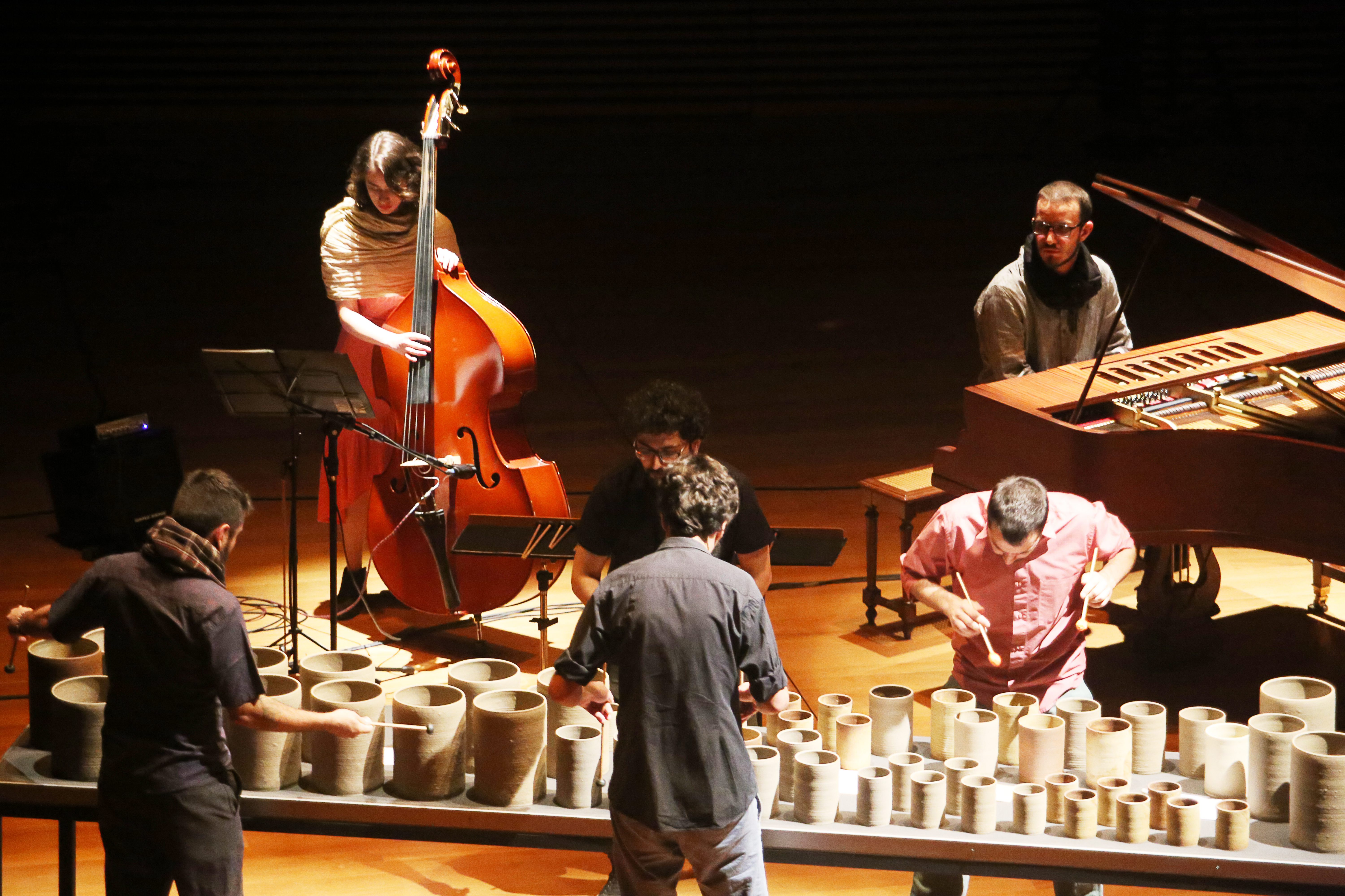 The installation is played with the hands, drumsticks and bow and the musical performance also includes acoustic bass, percussion, clarinets, piano and voice. The MINERAL concert gathered a group of virtuous musicians willing to experiment musical languages: Bruno Velloso, Davi Fonseca, João Paulo Drummond, Kristoff Silva, Leandro César, Pedro Durães, Juliana Perdigão and Yuri Vellasco. The arrangements were written especially for the sound created by the set of instruments and Leandro signs the arrangement for “Laguna de Água” by Argentine composer Carlos Aguirre.