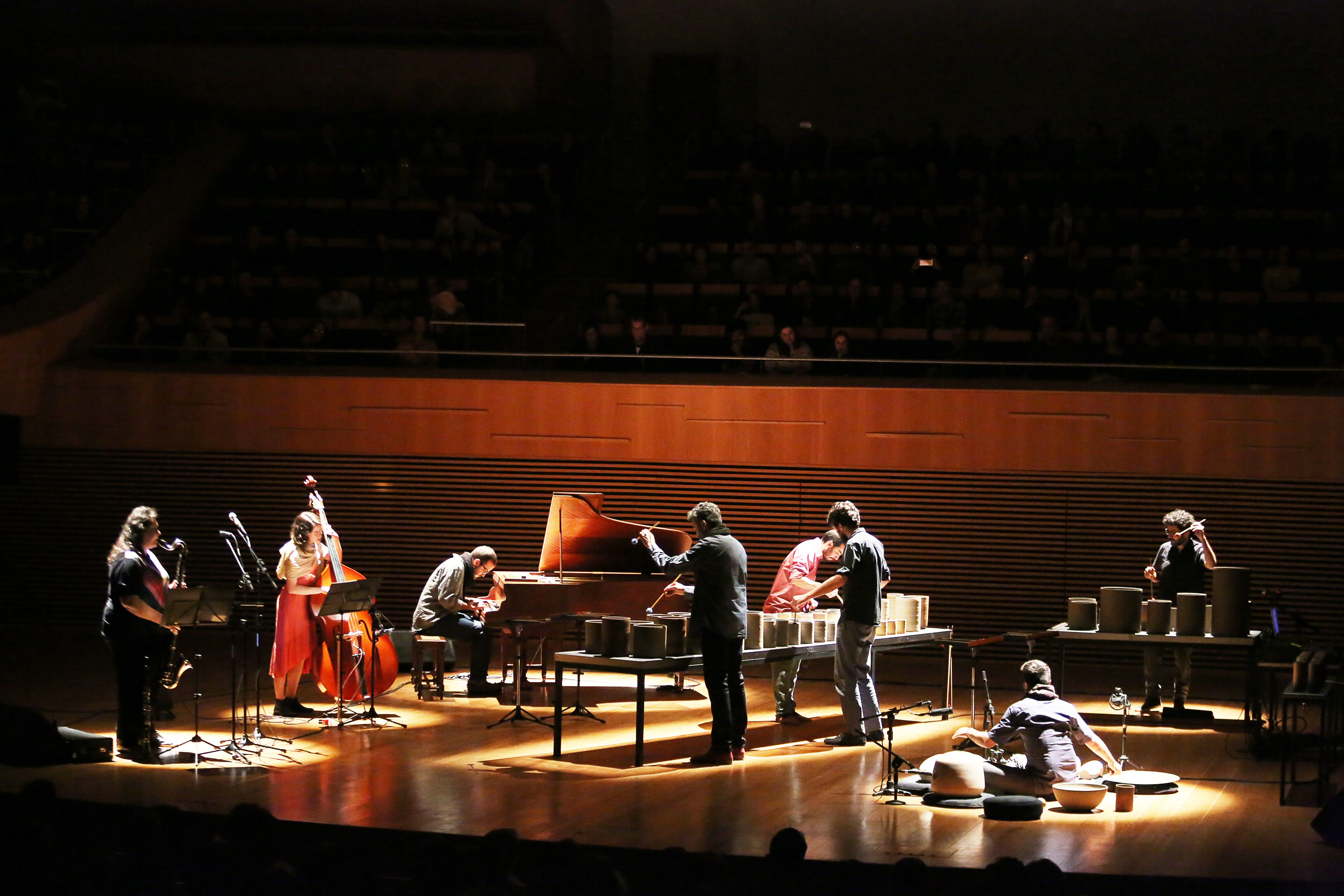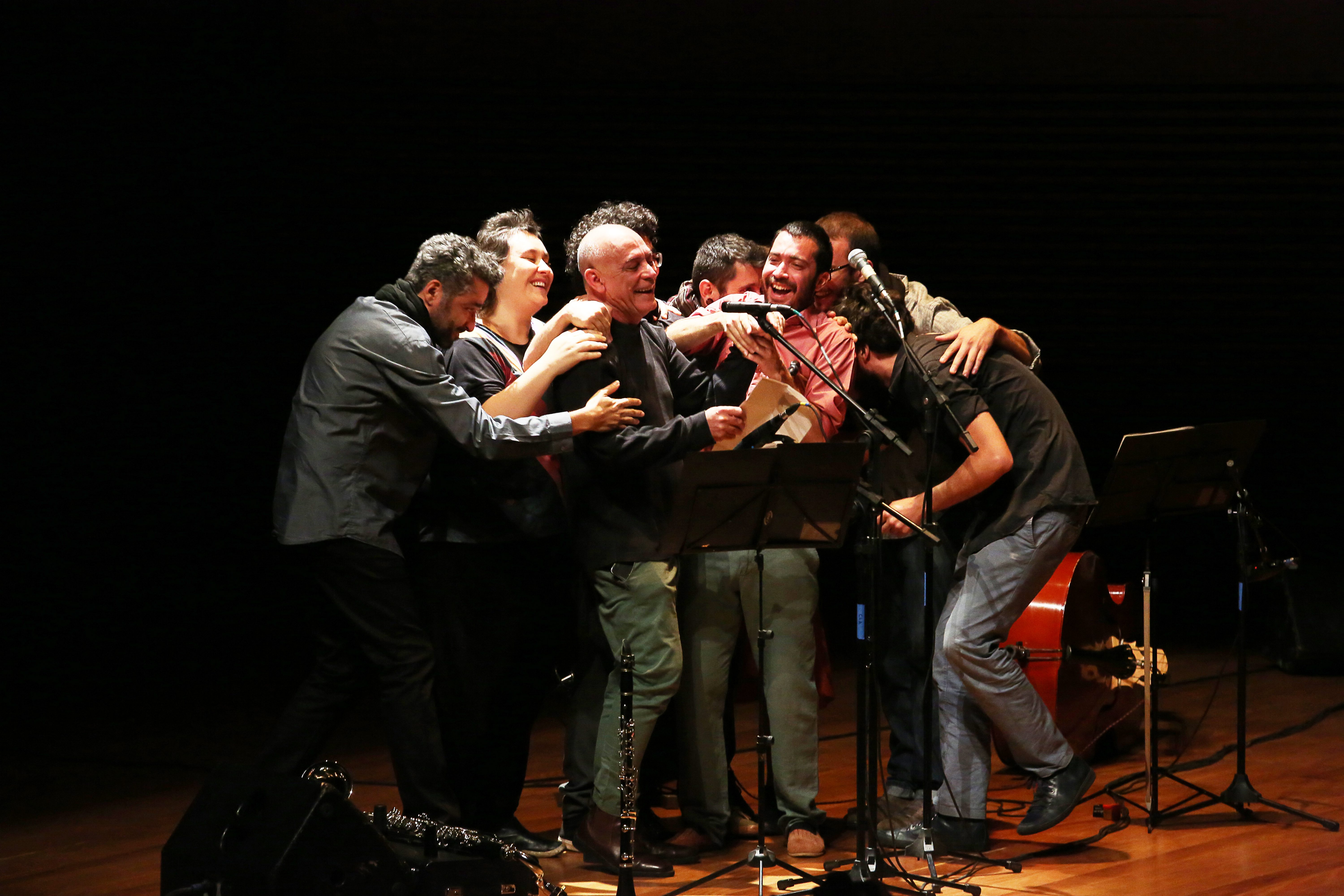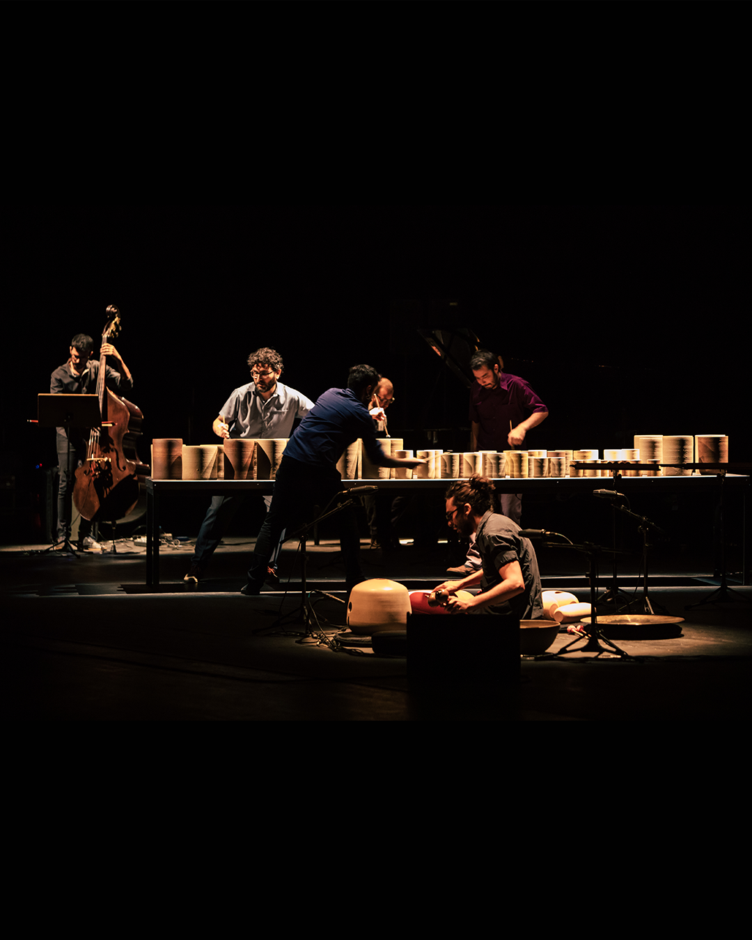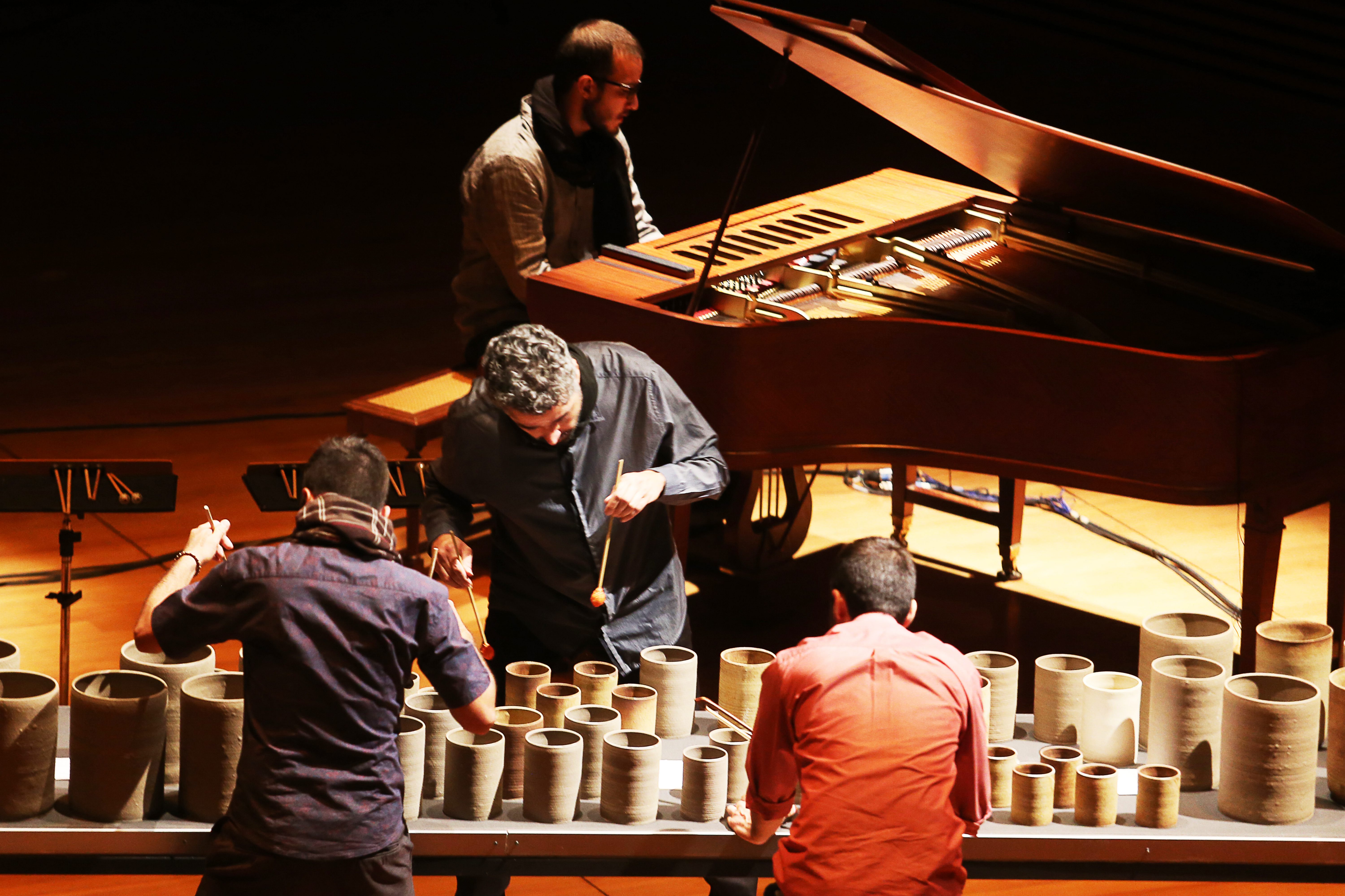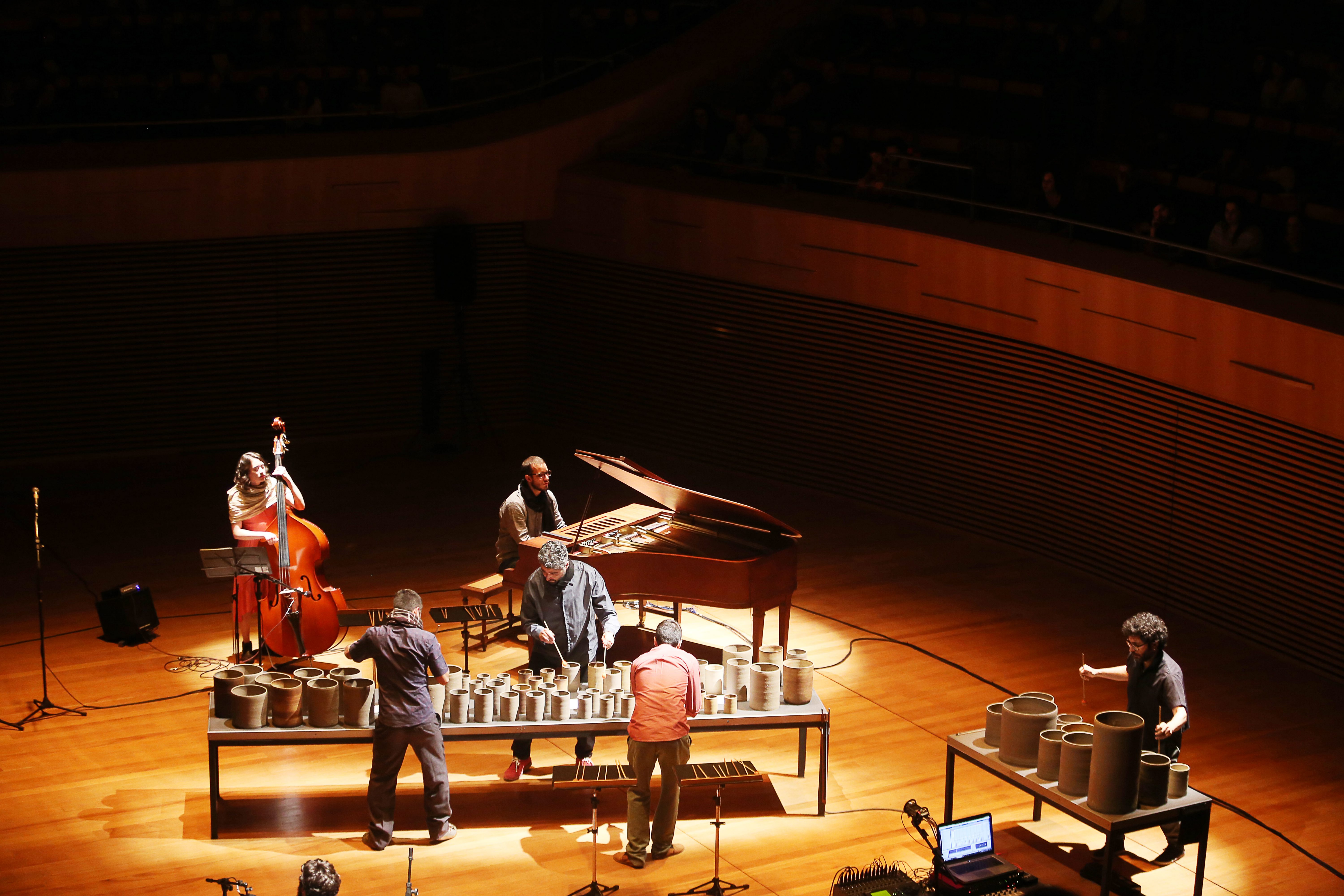 The installation is played with the hands, drumsticks and bow and the musical performance also includes acoustic bass, percussion, clarinets, piano and voice. The MINERAL concert gathered a group of virtuous musicians willing to experiment musical languages: Bruno Velloso, Davi Fonseca, João Paulo Drummond, Kristoff Silva, Leandro César, Pedro Durães, Juliana Perdigão and Yuri Vellasco. The arrangements were written especially for the sound created by the set of instruments and Leandro signs the arrangement for “Laguna de Água” by Argentine composer Carlos Aguirre.