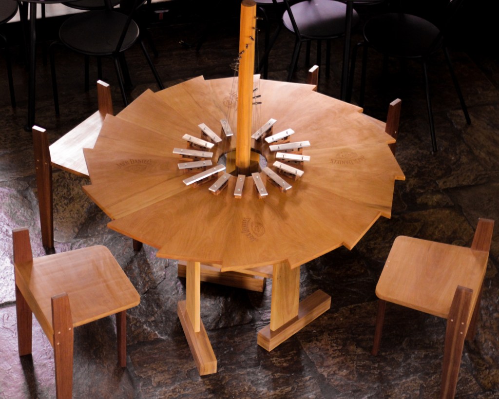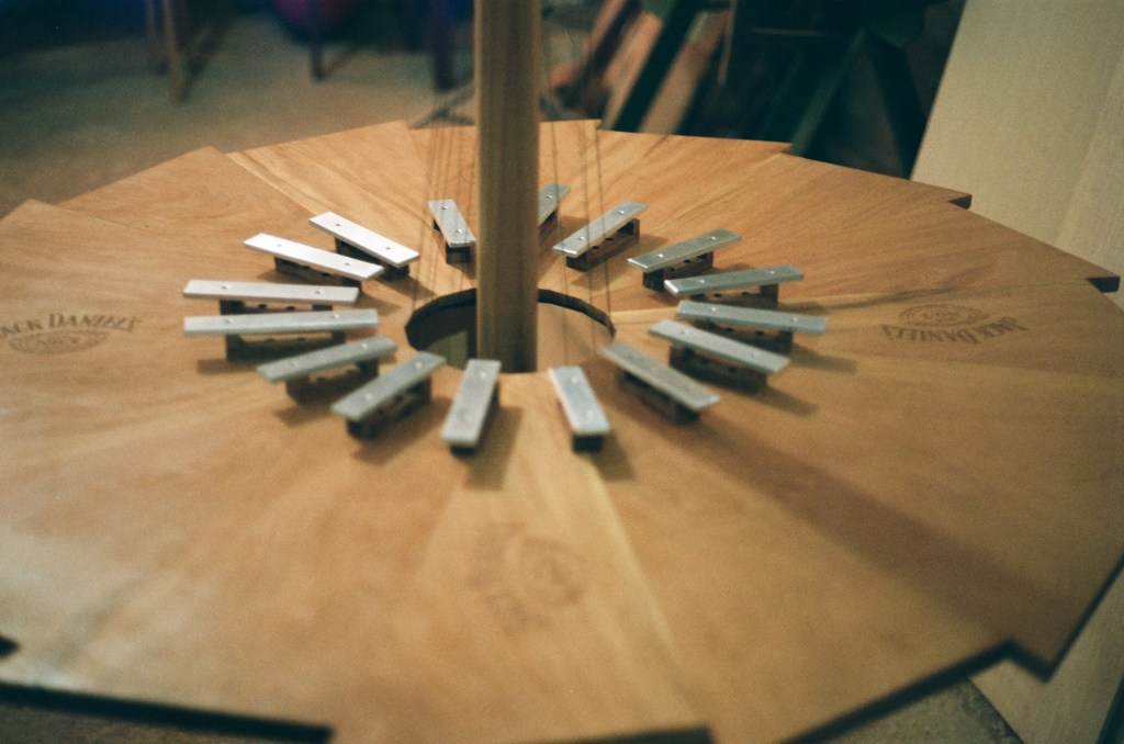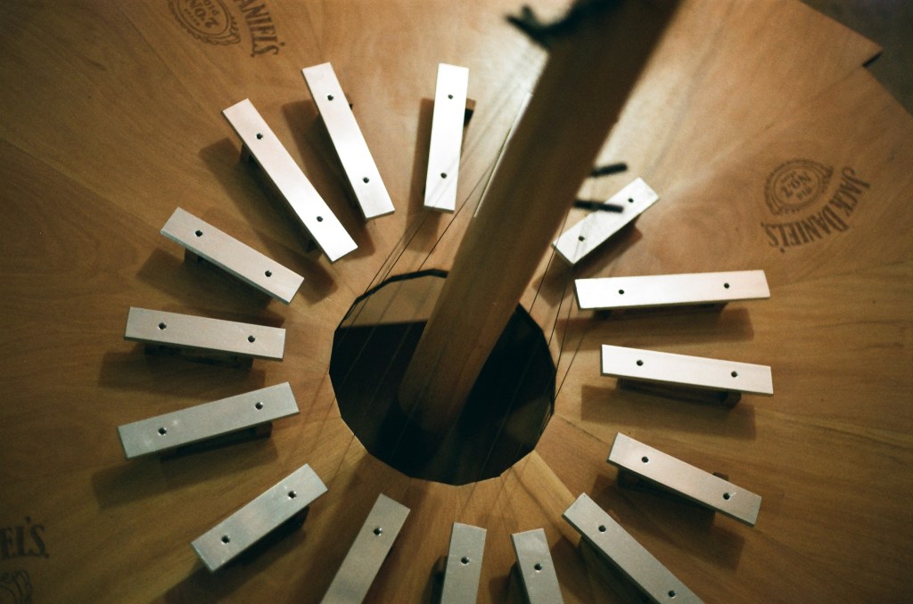 Made in Peroba, a wood from Brazil, the land of the sun, the table has a vibrant yellow color. There are 16 strings and 16 metal keys. The strings are vertical and spiral, like a peak, an “arrow” pointing to the sky. The metal keys are horizontal, pointing to the 16 directions of the compass. The tuning is mostly diatonic, but there is some unpredictability: a “chaos” on this “regular” course.